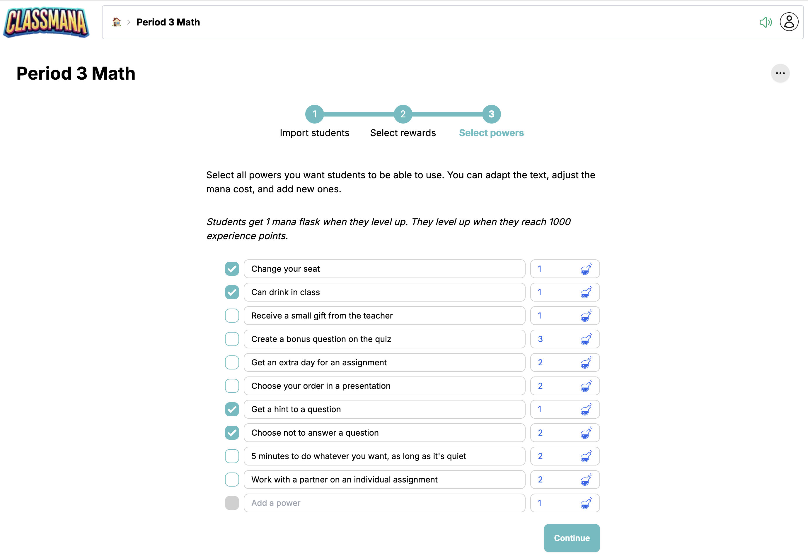 Després de crear la teva classe, passaràs per un assistent de configuració de 3 passos per configurar estudiants, recompenses i poders.
