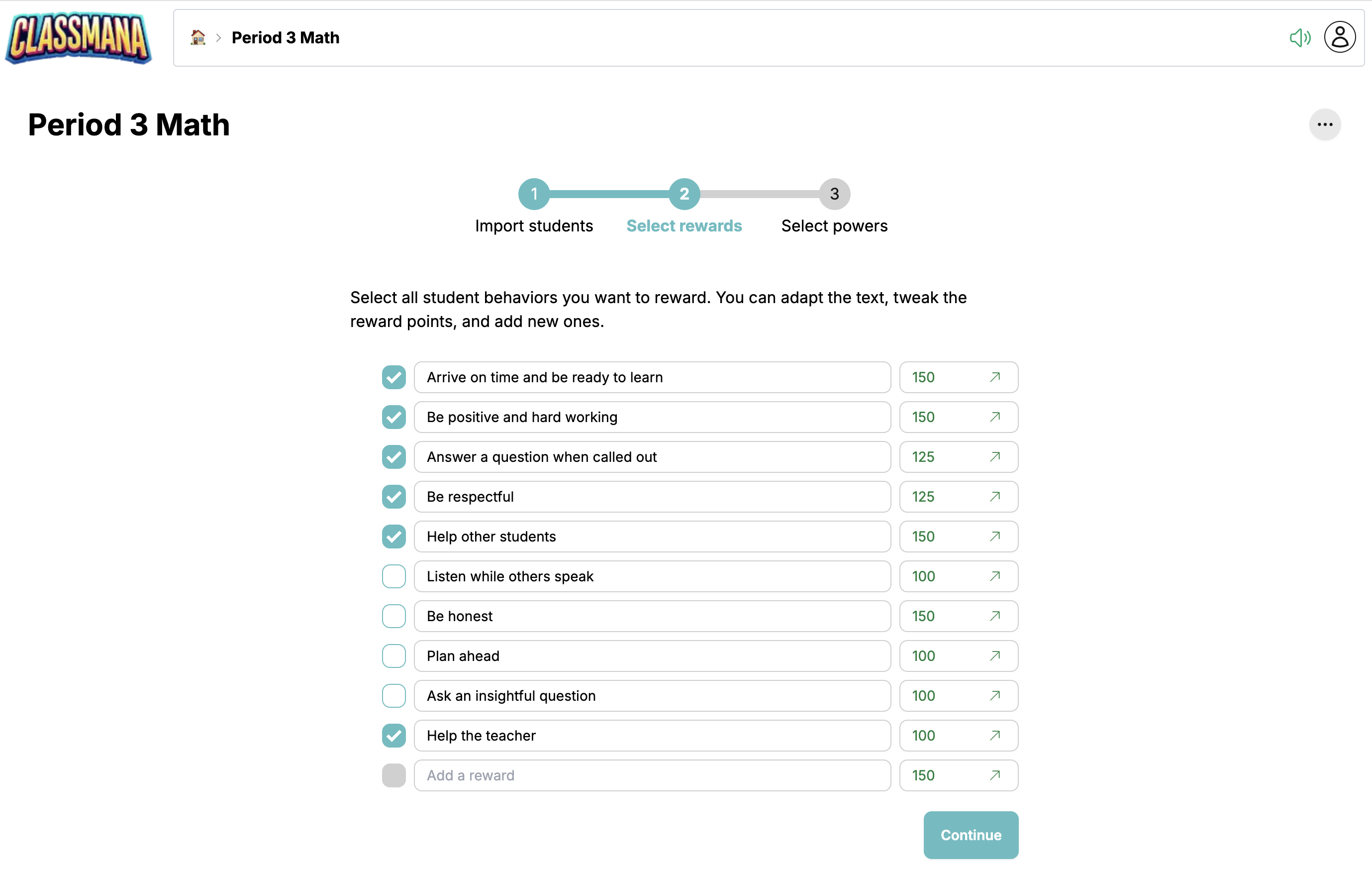 Selecciona les recompenses que vols utilitzar, personalitza els valors de punts si cal, afegeix les teves pròpies, després fes clic a "Continuar".