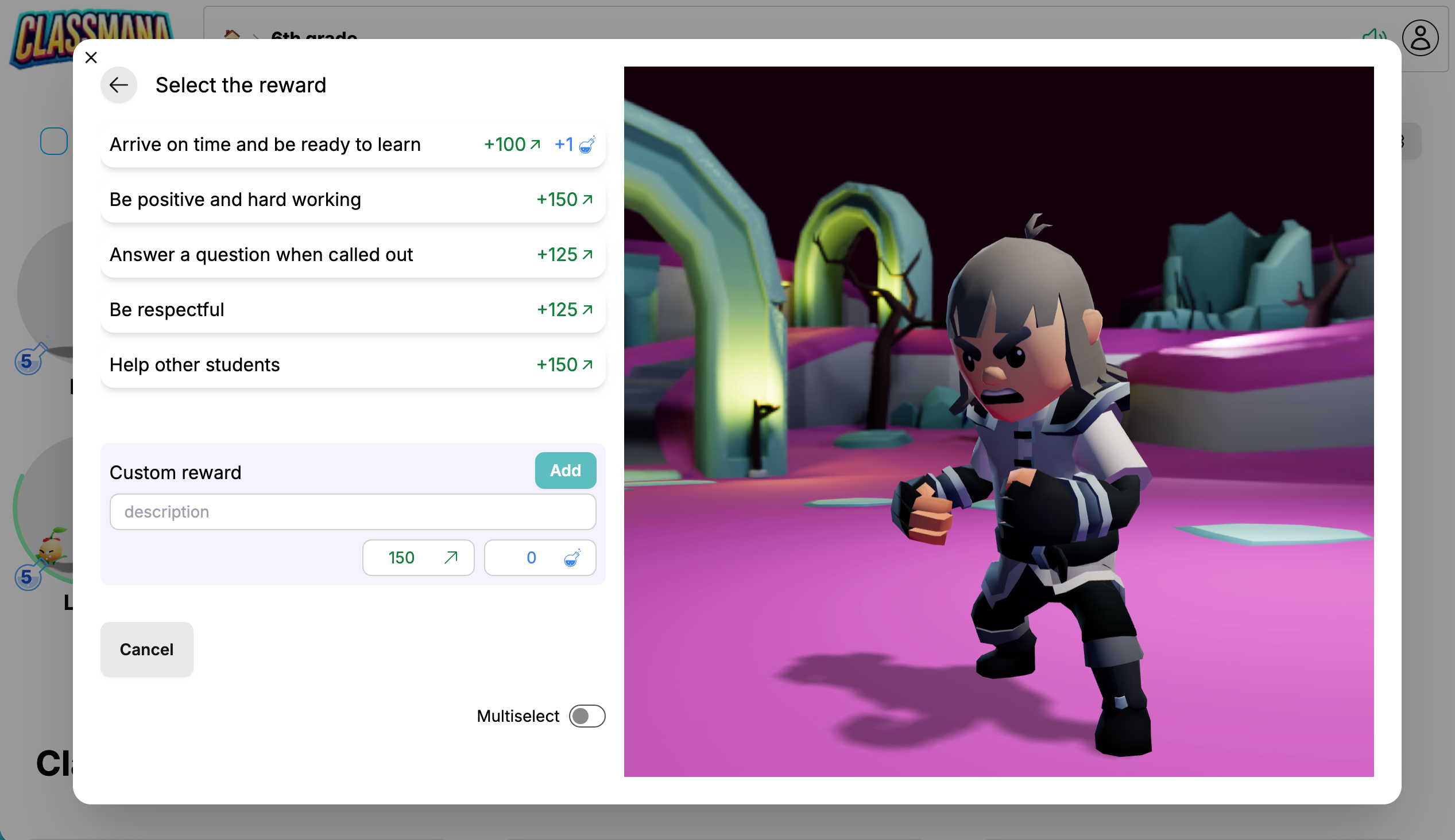 El panell de recompenses funciona de la mateixa manera - fes clic a una recompensa preconfigurada o crea'n una personalitzada. La recompensa s'aplicarà a tots els estudiants seleccionats.
